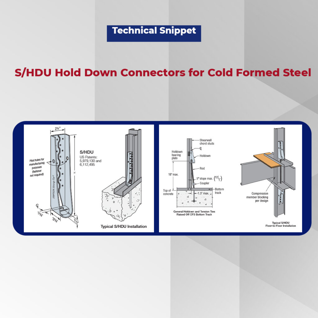 The S/HDU series of holdowns combines performance with ease of installation. The pre-deflected geometry virtually eliminates material stretch, resulting in low deflection under load. Installation using self-drilling screws into the studs reduces installation time and saves labor cost.These typical hold-downs are used for concrete to floor , floor to floor.